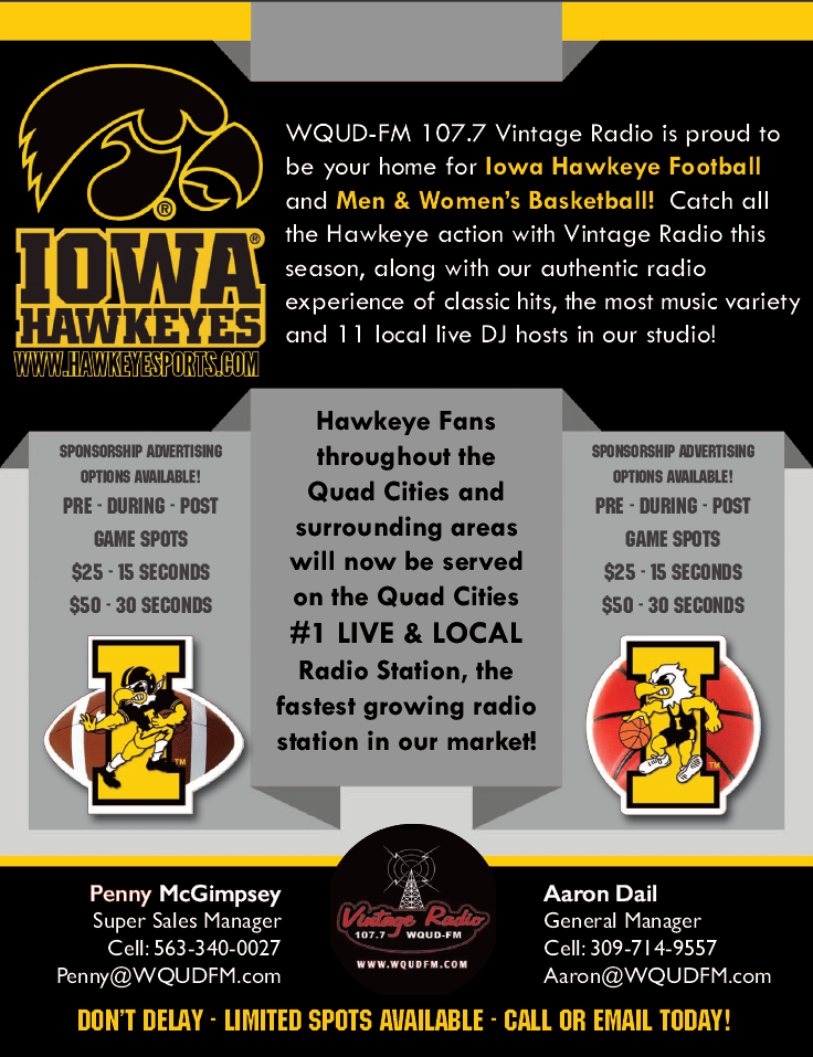 Iowa Hawkeye Sports Tune into 107.7 FM or Download the myTuner Radio app, search WQUD or stream live HERE